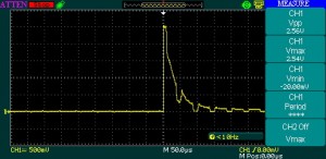 The first, shows my version 3.2 inverter output, that uses a NPN oscillating transistor in an Armstrong oscillator, and a feedback mechanism constructed with zenner diodes set for 400V, that triggers an oscillator-blocking second transistor. Illustrated as trace for CH1 – yellow, set for 400V.