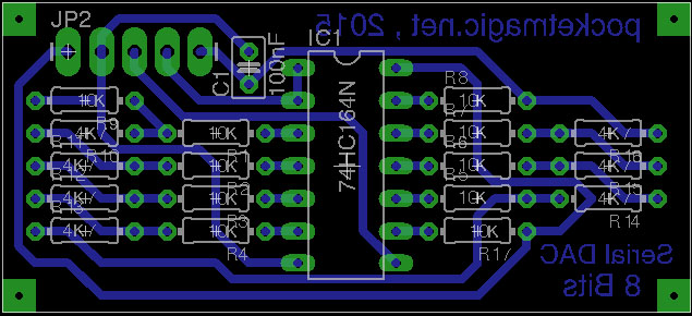 The idea is to go for a serial DAC, in order to save pins on the microcontroller. For this application, I’ve selected an 8bit shift register, the 74HC164, to use only two pins on the microcontroller and have the serial data converted to 8 parallel pins.