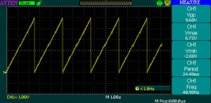 In the case of the shifted sinus function ( f(i) = (1+sin(i))*256 or f(i) = 128 + sin(i)*128 ), the resulting signal shape is influenced by the output capacitor and the time base of the generator. See the following code and it’s result, given the filter capacitor was set to 22nF . Notice that for higher frequency signals, choosing the right filter capacitor can become an issue.