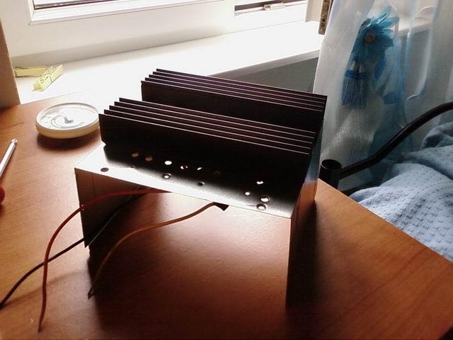 An aluminum heat-sink was added to the case, fixed tightly with several screws so the case itself would also absorb some of the extra heat, for better efficiency. Part of the case was cut so that I could fit a voltmeter and some power transistors directly on the aluminum heatsink: